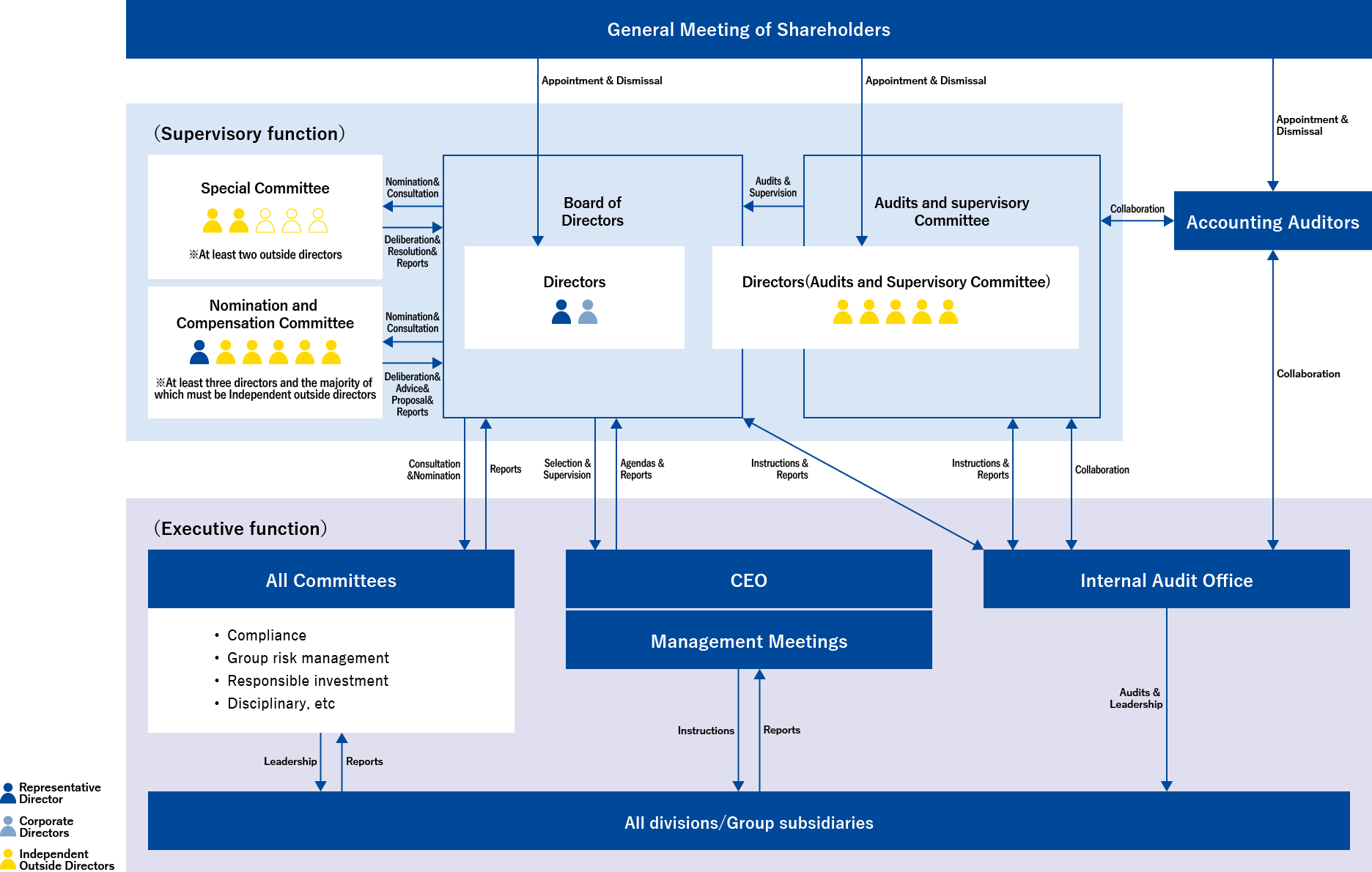 The Company's Audit and Supervisory Committee consist of the five outside directors (all of them are independent outside directors). It monitors the compliance and appropriateness of the Company's operations. The term of office for directors serving on the Audit and Supervisory Committee is two years. In addition, to further reinforce the Committee's supervisory function―given that it is composed solely of outside directors―the Internal Audit Department, which examines overall management activities and conducts operational audits, works in close coordination with the Committee.