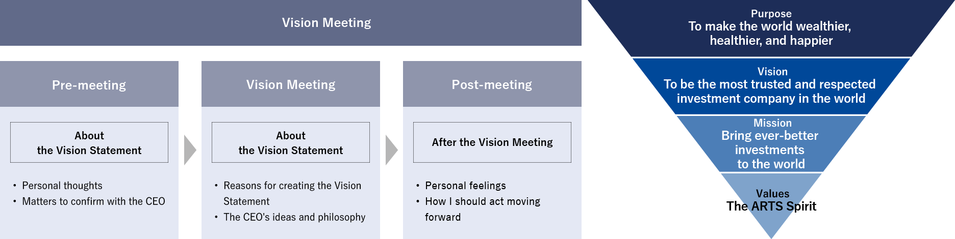 Encouraging understanding and resonance with our vision statement, which articulates our corporate philosophy, and proactively embodying it are essential for bolstering our organizational foundation and ensuring sustainable business management. Over 90% of the Group's organization comprises mid-career hires with diverse backgrounds. We believe that having our employees deeply understand and resonate with our corporate philosophy fosters a strong desire to find meaning and pride in their work with us and to contribute as valued members of the organization.