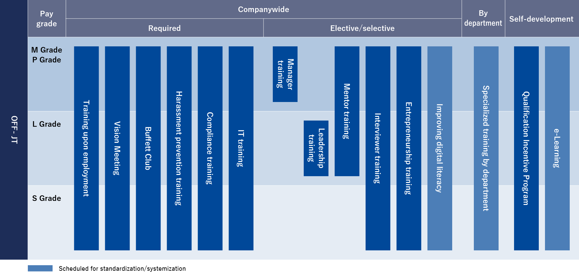 While we emphasize on-the-job training (OJT), we also offer a variety of off-the-job training programs. We have introduced training and frameworks to deepen understanding of our vision statement and Code of Conduct and to encourage employees to feel unified in organizational operations. We also provide training programs, such as management skills enhancement, targeting the next generation of middle management who will drive future business growth. Moving forward, we will strive to enhance departmental training to systematically develop employees with specialized knowledge and skills in all departments. We also believe that bringing in human resources with diverse backgrounds and knowledge across different fields will introduce new perspectives and novel ideas, leading to innovation. To this end, we will endeavor to provide learning opportunities where individual employees can learn autonomously and satisfy their intellectual curiosity in a wide range of areas, even outside their area of expertise.