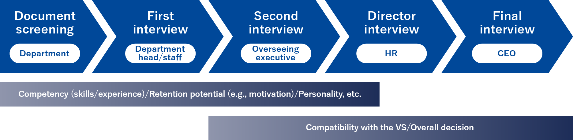 During interviews, as many officers and employees as possible meet with candidates to give everyone a chance to get to know each other. Executive officers, directors, and the CEO join department heads and team members in the selection process. Recruitment decisions are made from various perspectives, including not only the candidate's potential contribution and retention within the department, but also their personality and their compatibility with our vision statement and organizational culture. Furthermore, to recruit a broad range of talent, we have introduced an employee referral program and established a system that allows candidates to apply directly through our company website, automatically entering our selection process.